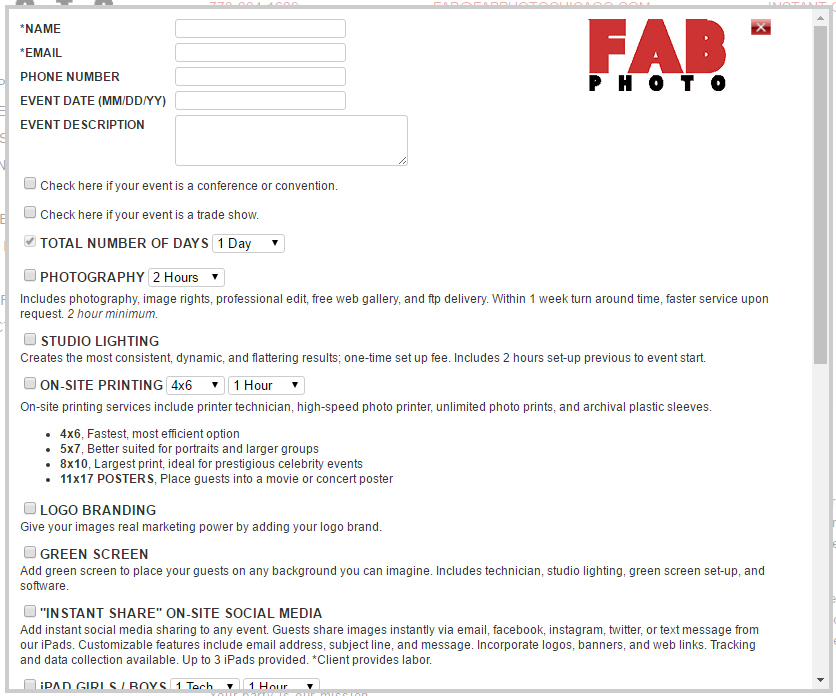 FAB PHOTO, Chicago's most fabulous event photographers, will both entertain and impress your guests with stylish event photography and interactive photo activities, including shoot and print photos instantly onsite, green screen photography, step and repeat portraits, social media instant share (featuring Facebook, twitter, email), iPad Girls, and the brand new interactive Fab Photo Station.